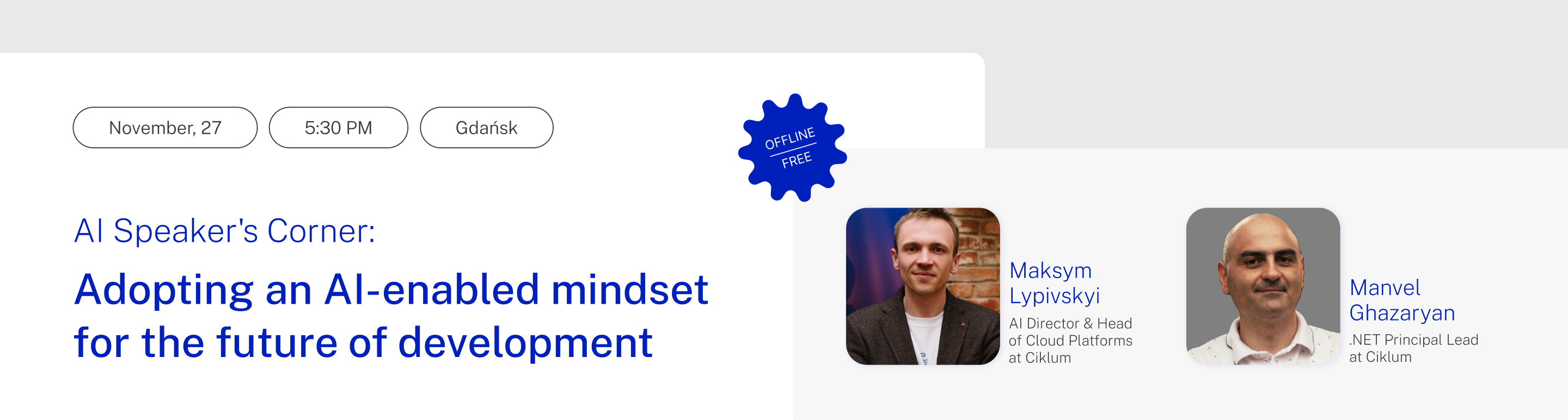 Join us at Speaker’s Corner as we explore how adopting an AI-enabled mindset can redefine engineers’ approach to software development. Manvel Ghazaryan, .NET Principal Lead, will share real-life examples of leveraging AI, from productivity boosts to intelligent automation. Maksym Lypivskyi, AI Director and Head of Cloud Platforms, will explain how to onboard AI in your work and life. Perfect for software engineers working on AI-powered projects.